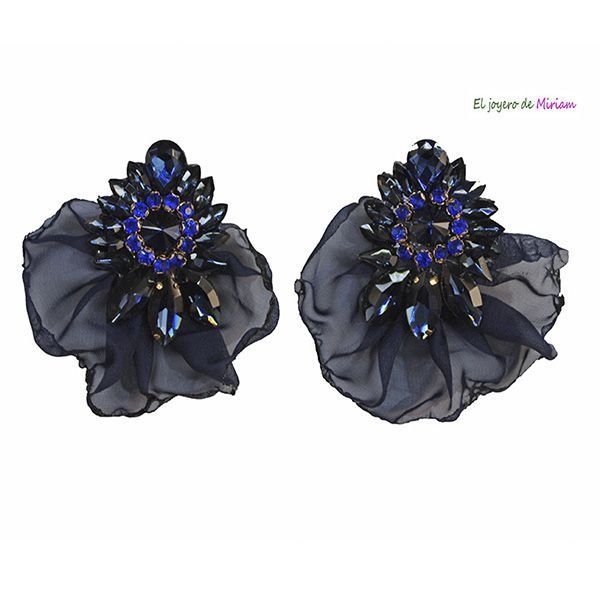 Preciosos pendientes AZUL MARINO de fiesta. Se tratan de unos pendientes decorados con cristales azules en forma de flor y decorados con pétalos de tela en color azul marino.
