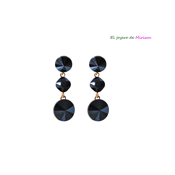 VV092435799 – Elegantes pendientes azul marino de fiesta. Se tratan de unos pendientes diseñados con tres cristales redondos en un elegante color azul marino y con la montura trasera montada en bisutería dorada.