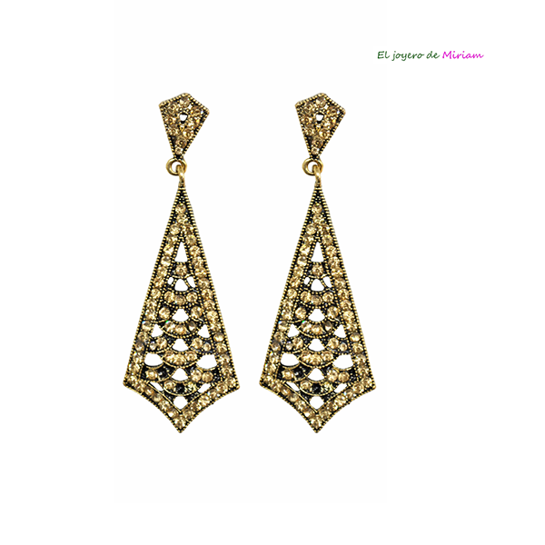 R04/5732 – Elegantes pendientes de fiesta dorados envejecidos. Se tratan de unos pendientes montados en bisutería dorada envejecida, diseñados originalmente y, decorados con pequeños cristales dorados. Son súper cómodos de llevar y quedan espectaculares al rostro. Constan de cierre a presión.