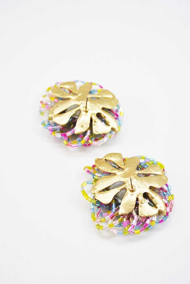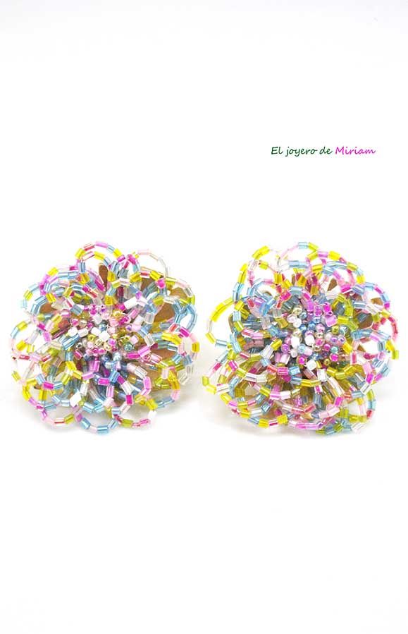 R02/4557 – Preciosos, llamativos y originales pendientes de mujer. Se tratan de unos pendientes montados sobre bisutería dorada. Están diseñados en forma de flor y decorados a base de cuentas multicolor destacando tonos en amarillo lima, celeste, fucsias, rosas y alguno que otro blanco. Constan de cierre a presión.