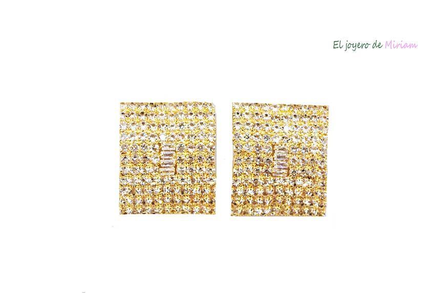 R19/3041 -Originales y estilosos pendientes dorados de mujer. Se tratan de unos pendientes rectangulares, pegados a la oreja y decorados con pequeños cristales blancos. Muy cómodos de llevar ya que apenas pesan. Además, presentan cierre a presión.