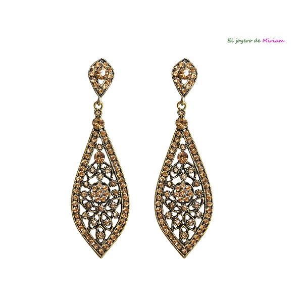 R04/5732 – Elegantes pendientes de fiesta dorados envejecidos. Se tratan de unos pendientes montados en bisutería dorada envejecida, diseñados en forma de lágrima y decorados con cristales también envejecidos. Son súper cómodos de llevar y quedan espectaculares al rostro. Constan de cierre a presión.