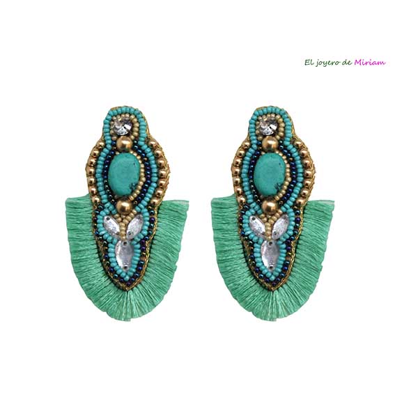 R04/5754 – Bonitos y originales pendientes artesanales de estilo étnico. Están decorados con cuentas turquesas y doradas, algún que otro cristal blanco y pequeños y elegantes flecos con hilos.