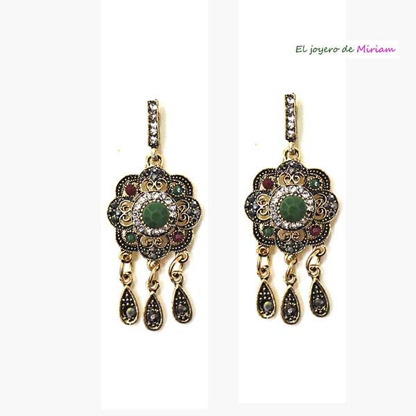 R03/4964 – Originales y atractivos pendientes de mujer. Se tratan de unos pendientes diseñados al estilo antiguo, fabricados en bisutería dorada envejecida y, decorados con pequeños cristales blancos y piedras facetadas combinadas en color burdeos con tono verde botella.