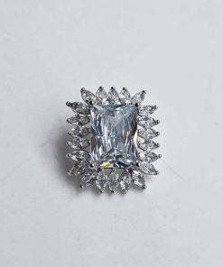 R04/5533 – Elegantes pendientes plateados de fiesta. Se tratan de unos pendientes montados sobre bisutería plateada y presentan un cristal blanco rectangular y cristales blancos más pequeños alrededor del mismo.