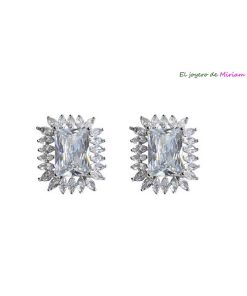 R04/5533 – Elegantes pendientes plateados de fiesta. Se tratan de unos pendientes montados sobre bisutería plateada y presentan un cristal blanco rectangular y cristales blancos más pequeños alrededor del mismo.