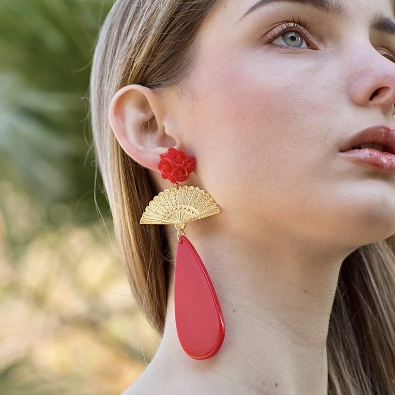 Espectacular diseño de pendientes de flamenca formado por una lágrima roja de resina, en la parte central encontramos un abanico dorado, y en la parte superior una flor de resina roja.