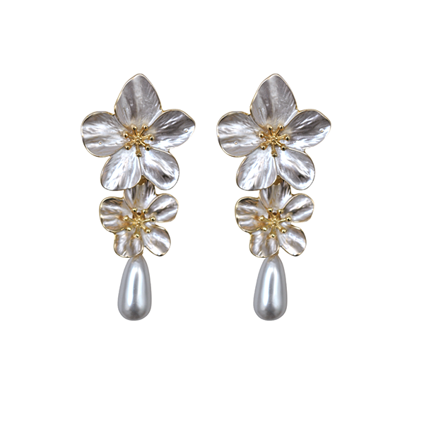 REF: 50250 – Pendientes elegantes con diseño de dos flores de efecto perla y con detalles dorados en el centro, acompañados también de una perla en forma de lágrima en la parte inferior. Un accesorio delicado y femenino, ideal para ocasiones especiales o para dar un toque sofisticado a tu look diario. Constan de cierre a presión.