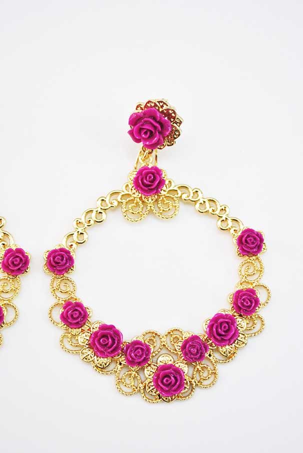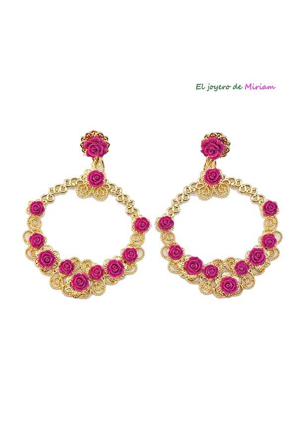 R02/4546 – Preciosos pendientes redondos de flamenca, tamaño XXL. Se tratan de unos pendientes fabricados en bisutería dorada, diseñados en forma circular y con decoraciones caladas, estilo antiguo. Destacan bellísimas rosas de resina esmaltadas en color fucsia. Cierre omega.