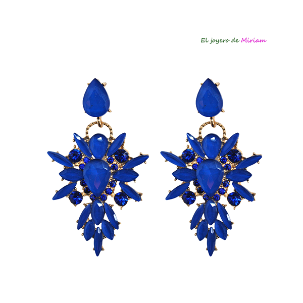 R04/5738 – Preciosos pendientes largos de mujer. Se tratan de unos pendientes montados sobre bisutería dorada, con diseño alargado en forma de flor y decorados con preciosos cristales en color azul eléctrico.