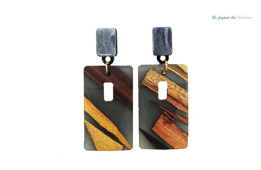 R19/3228 -Originales y llamativos pendientes de mujer. Están montados sobre metal ligero dorado. Llama mucho la atención su diseño, esmalte en tonos grises y aplicaciones de madera, tendencia que arrasa esta temporada.