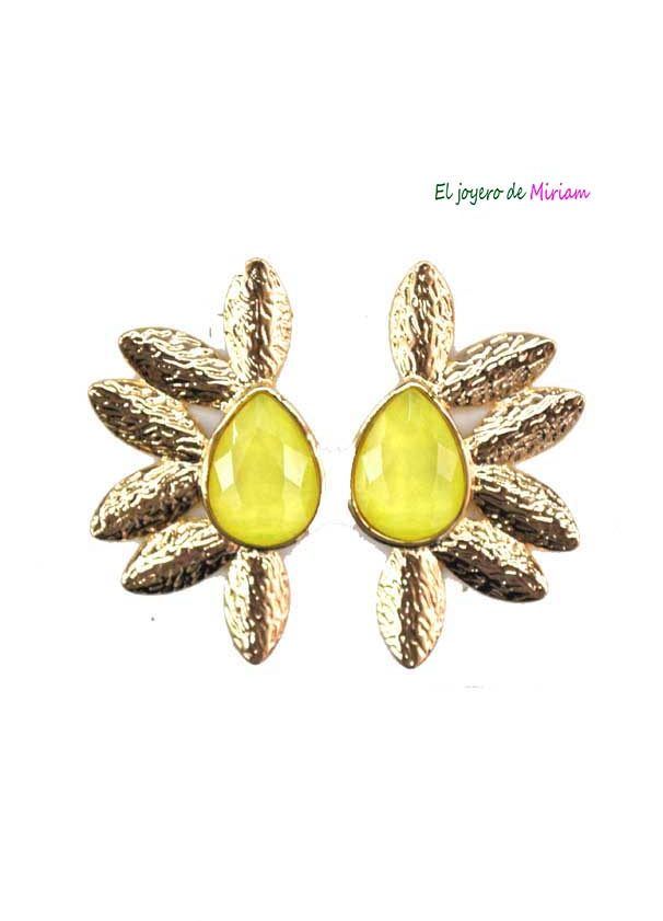 R02/4822 – Originales pendientes lima de fiesta. Se tratan de unos pendientes montados sobre bisutería dorada y, diseñados en forma de hojas de metal ligero, decorados con cristales amarillo lima. Constan de cierre a presión.