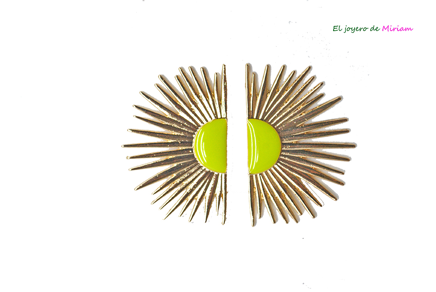 R03/5234 – Bonitos pendientes de fiesta dorados y verde lima. Están fabricados en metal ligero dorado, diseñados en forma de sol y, decorados con piedras de resina esmaltada en color verde lima. Constan de cierre a presión.