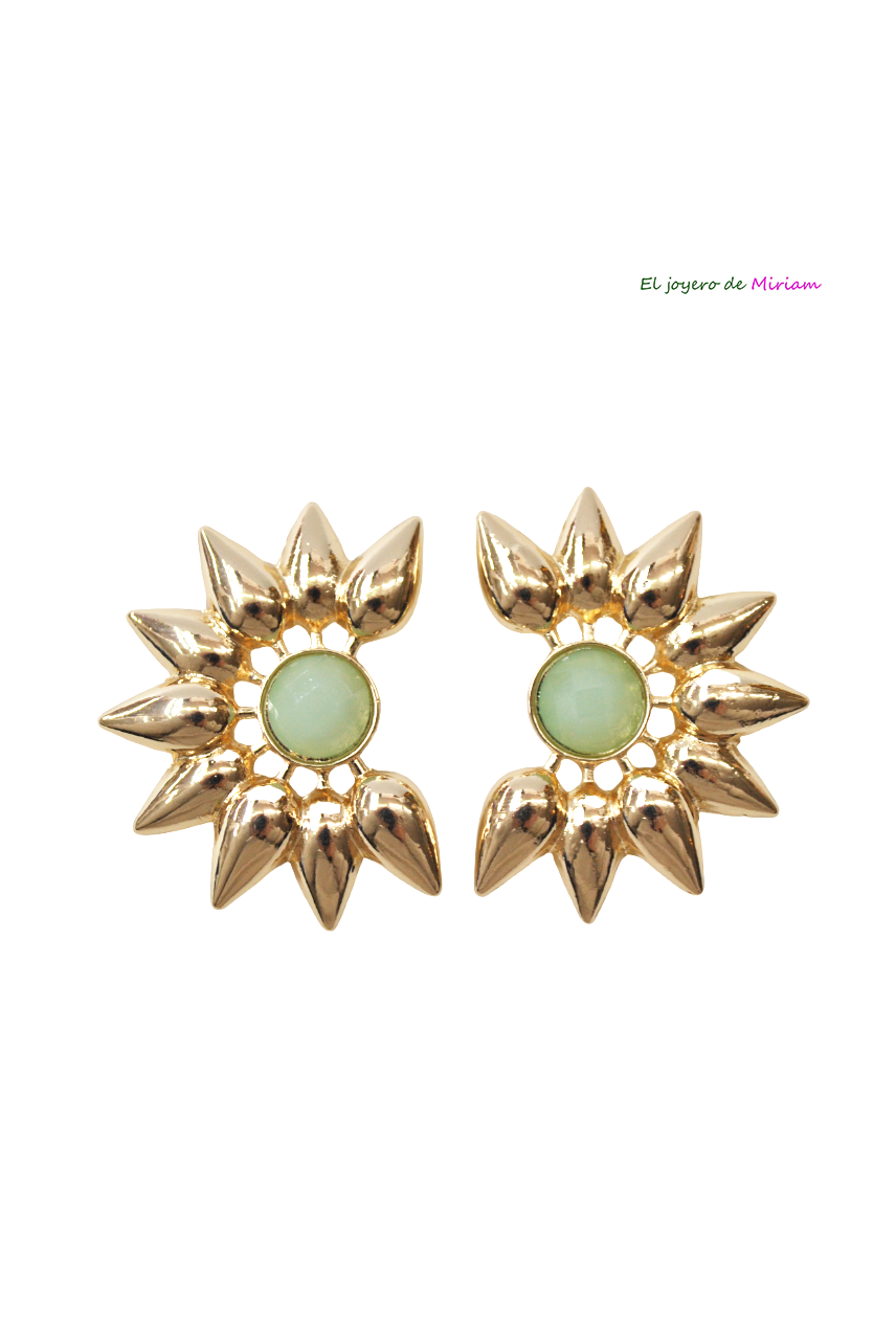 R02/4822 – Elegantes y bonitos pendientes dorados de mujer. Se tratan de unos pendientes fabricados en bisutería dorada de metal decorados con piedras centrales de resina en un precioso color verde menta.