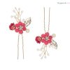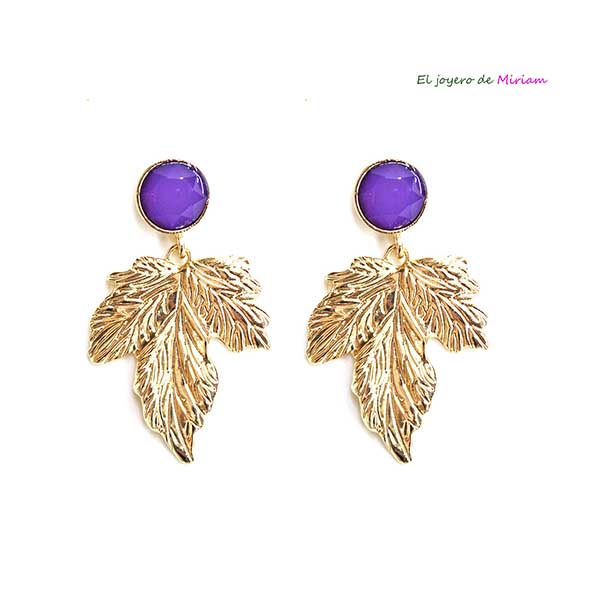 R03/5089 – Estilosos y bonitos pendientes dorados y morados. Están fabricados en bisutería dorada con diseño en forma de hojas y presentan decoraciones con piedras redondas de resina en color morado.