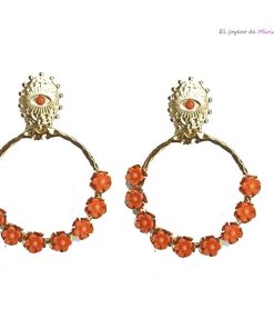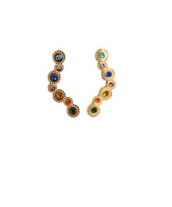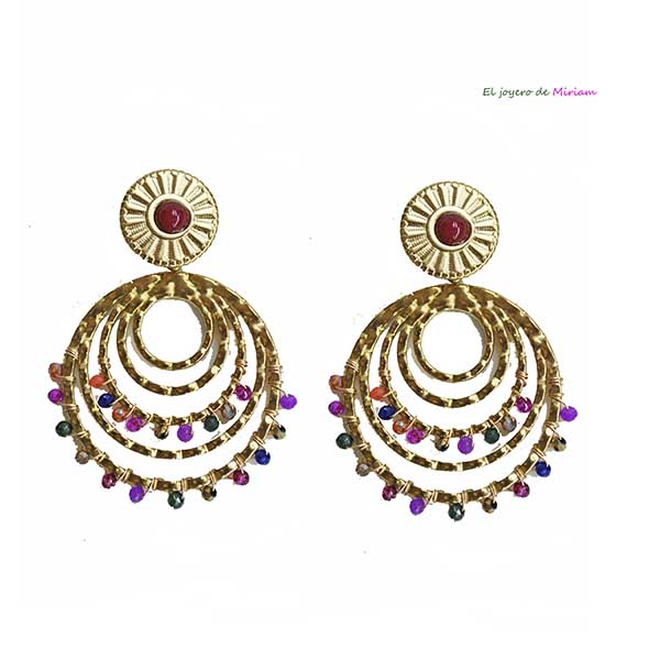 R03/5146 – Originales pendientes multicolor y dorados. Se tratan de unos pendientes fabricados en acero inoxidable y decorados con pequeños cristales multicolor. Constan de cierre a presión.