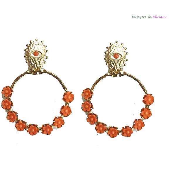 R03/5145 – Estilosos y elegantes pendientes naranjas. Se tratan de unos pendientes fabricados en acero inoxidable dorado. Están diseñados en forma de aro y presentan pequeñas flores naranjas de resina.