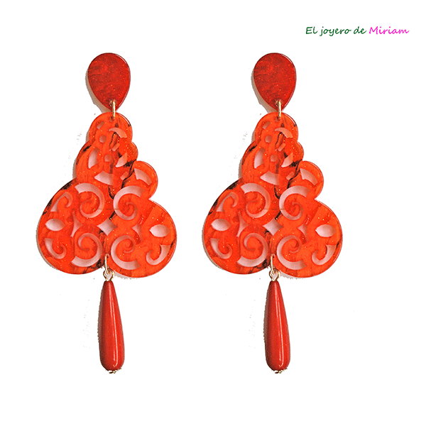 R03/5165 – Bonitos y originales pendientes largos. Se tratan de unos pendientes naranjas fabricados en resina esmaltada con ligeros y elegantes brillos. De estilo flamenca y muy cómodos de llevar ya que no pesan nada. Constan de cierre a presión.