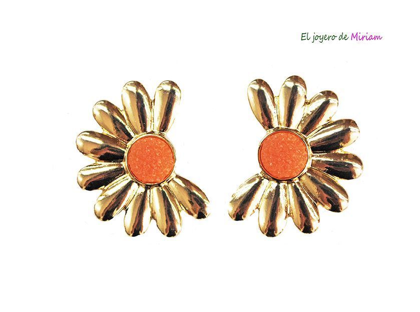 Originales pendientes fabricados en metal ligero dorado con ligera forma de margarita decorados con piedras centrales de color naranja. Ideales para el día a día o eventos especiales o para el día a día. Son muy cómodos de llevar ya que no pesan nada.