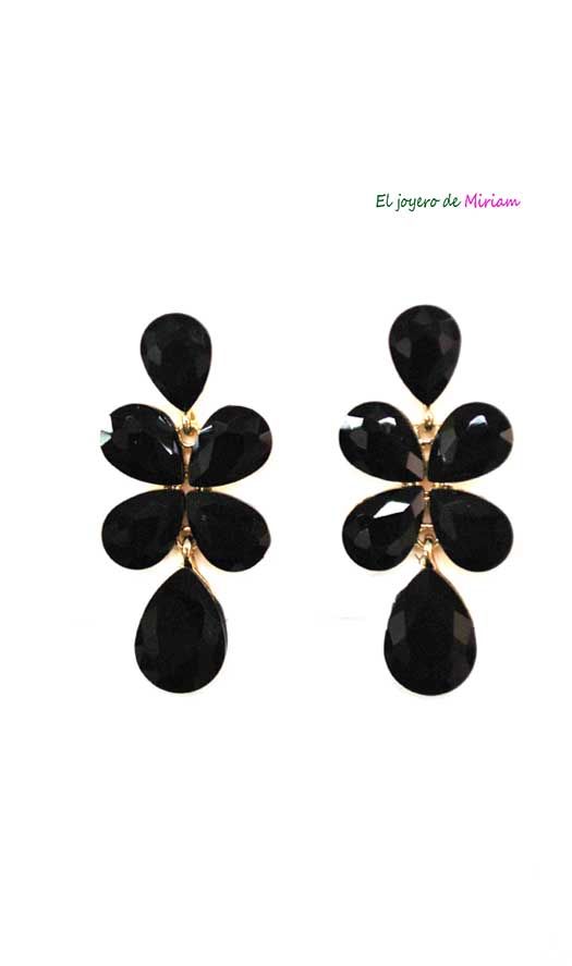 R02/4826 – Pendientes de fiesta realizados con cristales NEGROS, diseño en forma de flor alargada. Dichos pendientes, están montados en bisutería dorada y podrás lucirlos con tu vestido de fiesta o noche en bodas, bautizos, comuniones y otros eventos, pendiente versátil que sera un estupendo fondo de armario ya que aporta color y luminosidad a tu rostro.