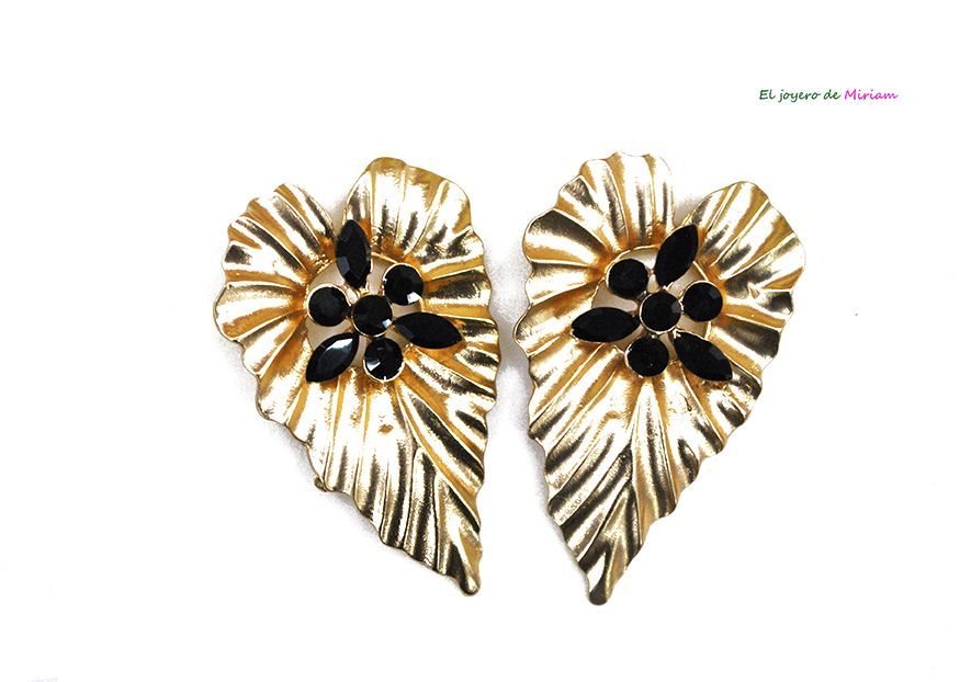 Elegantes pendientes de fiesta diseñados en forma de hoja, en metal ligero dorado y con decoraciones de cristales en la parte central de color negro .