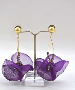 R02/4893 – Elegantes pendientes de mujer montados en bisutería ligera dorada. Están decorados con cuentas y con pétalos de tela en color morado cardenal diseñados en forma de flor.