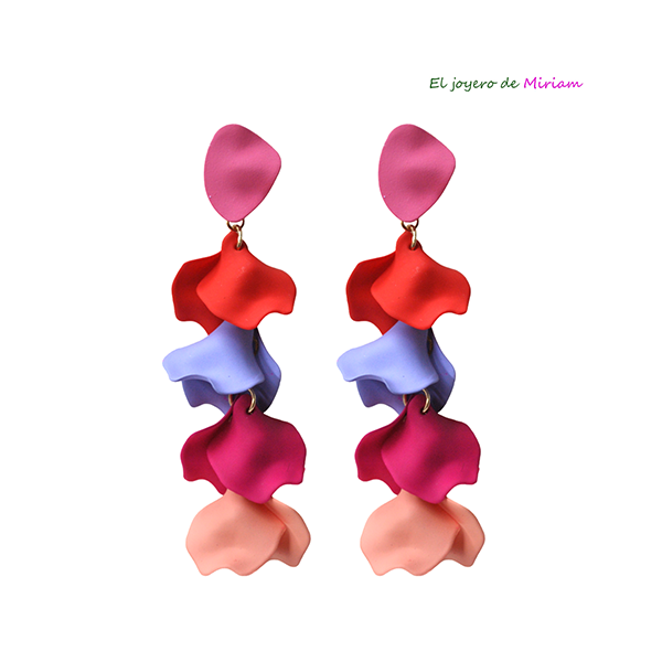 R03/5226 – Preciosos pendientes largos de fiesta. Se tratan de unos pendientes largos, diseñados con pequeños pétalos de resina combinados en varios tonos. Constan de cierre a presión.