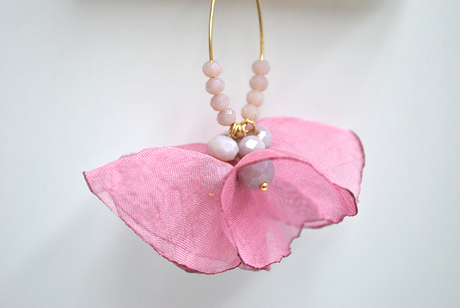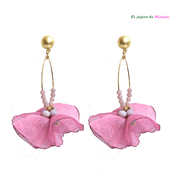 R03/5228 – Elegantes pendientes de mujer montados en bisutería ligera dorada. Están decorados con cuentas y con pétalos de tela en color rosa empolvado diseñados en forma de flor.