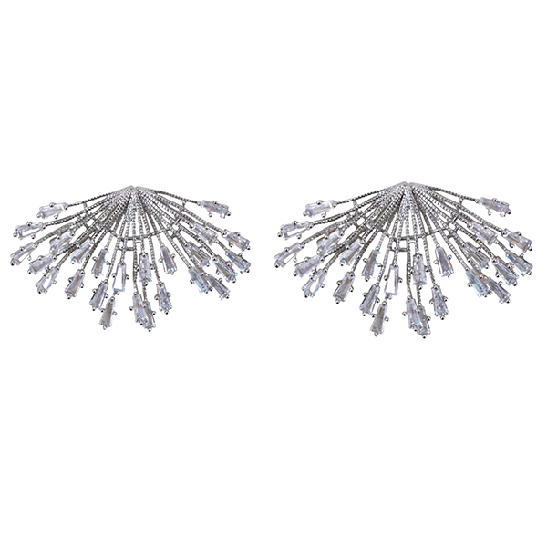 REF: 72430 – Pendientes en forma de abanico compuestos por finas varillas plateadas decoradas con pequeños cristales transparentes. Un diseño moderno y sofisticado que aporta brillo y movimiento, ideal para eventos elegantes o looks nocturnos. Constan de cierre a presión.