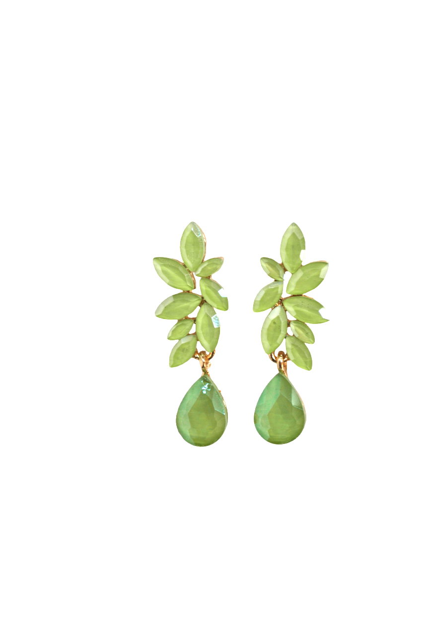 Bonitos y originales pendientes de fiesta color verde lima. Se tratan de unos pendientes montados sobre bisutería dorada, diseñados en forma de hojitas y una elegante lágrima colgante.