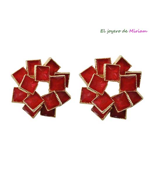 R04/5498 – Preciosos pendientes rojos de fiesta. Se tratan de unos pendientes decorados con pequeños cristales rectangulares y quedan pegados a la oreja. Están montados sobre bisutería dorada y constan de cierre a presión.