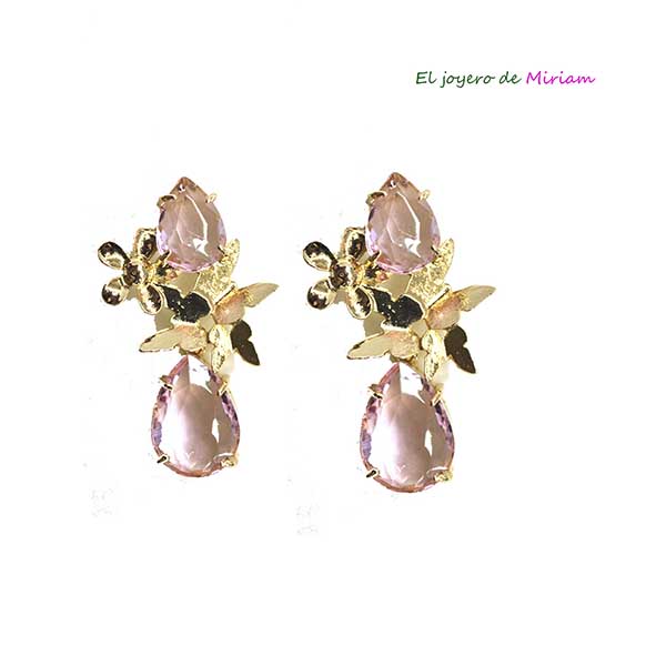 R03/5281- Elegantes pendientes rosa nude de fiesta. Se tratan de unos pendientes decorados con lágrimas de cristal en color rosa nude y, aplicaciones en metal dorado de flores y mariposas. Constan de cierre a presión.