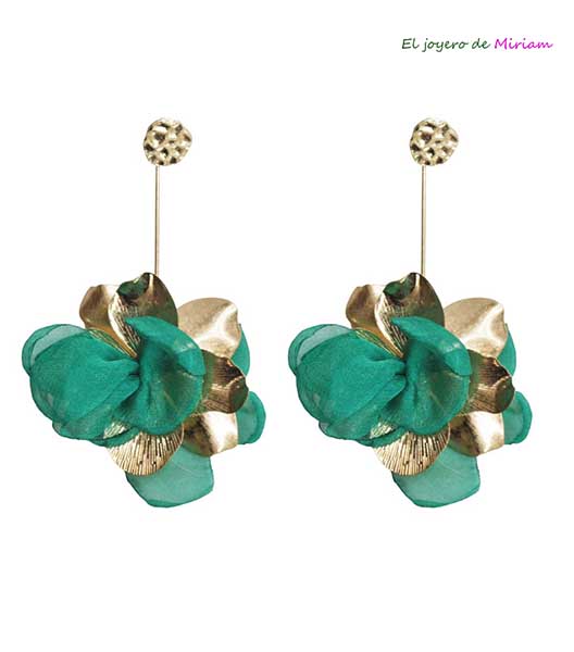 R04/5560 – Originales pendientes largos turquesa. Se tratan de unos pendientes montados sobre bisutería dorada y decorados con una flor de metal dorado y pétalos turquesas.