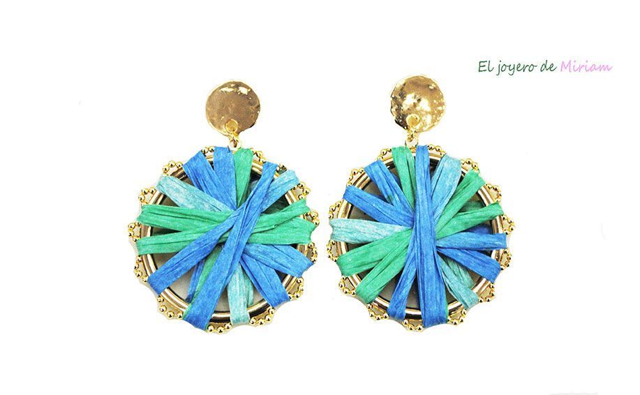 R21/3759 -Originales pendientes redondos fabricados en metal ligero dorado. Presentan forma de círculo y están decorados con papel de color azul turquesa combinado con azul cielo.