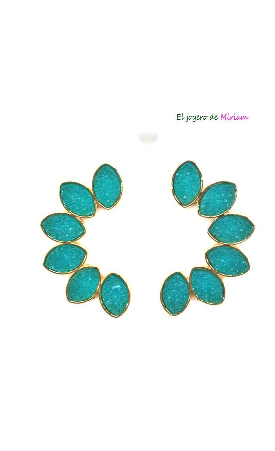 R02/4823 – Elegantes pendientes turquesas de mujer, versátiles y cómodos de llevar. Se tratan de unos pendientes montados sobre bisutería dorada y decorados con piedras diseñadas en forma de lágrimas. Constan de cierre a presión.