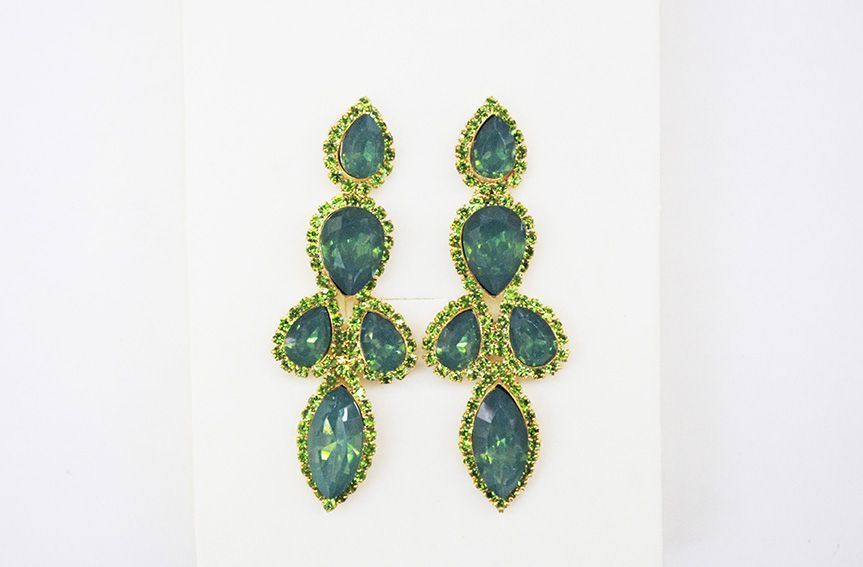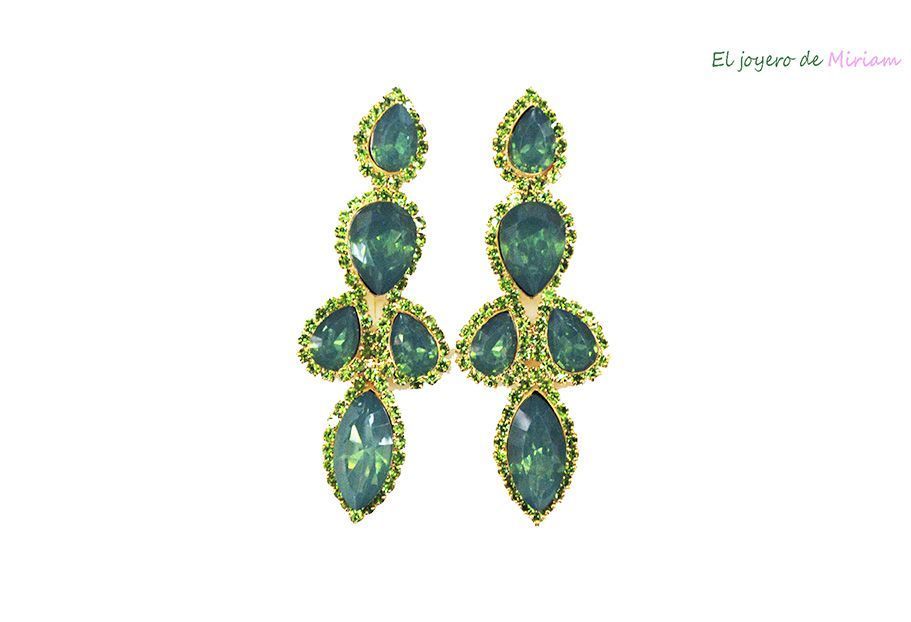 R19/2420 -Pendientes largos de fiesta montados en bisutería dorada y decorados con preciosos cristales verde agua y pequeños brillantes verdes, te verás divina con ellos, quedan espectaculares y son muy cómodos de llevar porque no pesan mucho, especial invitadas y madrinas de bodas.