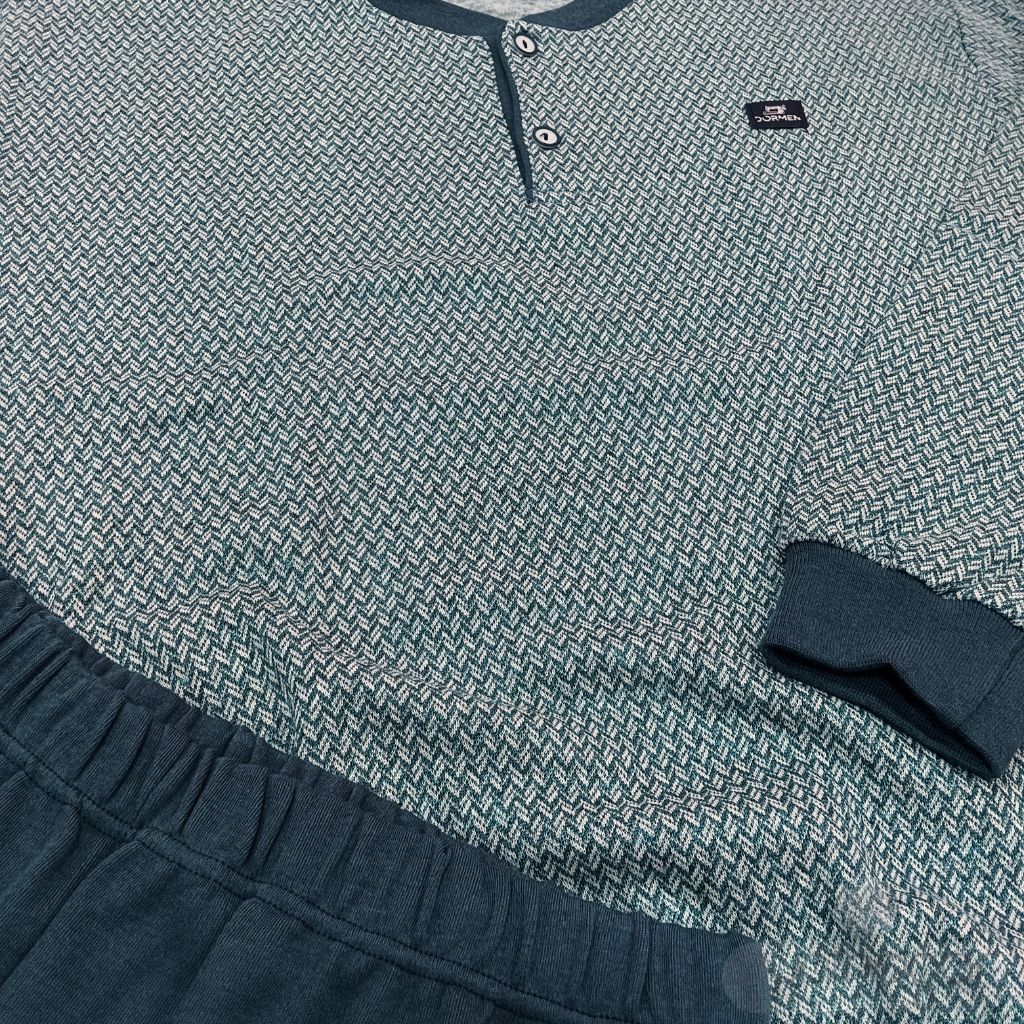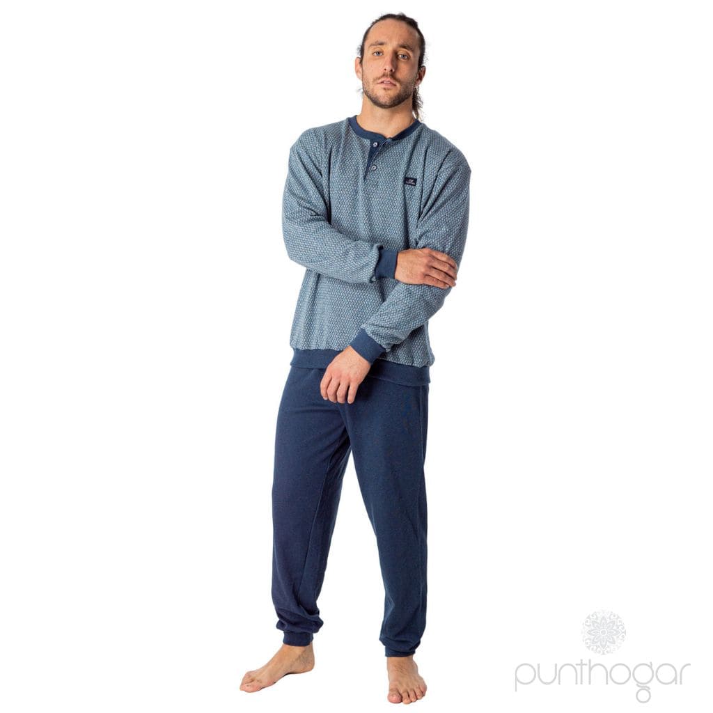 Conjunto de pijama para hombre de dos piezas, confeccionado en un tejido de punto afelpado de algodón y poliéster, que implica que sea suave, cálido y confortable para dormir. La chaqueta presenta un diseño estampado de espigas en color azul de cuello redondo tipo panadero con la tapeta de dos botones que le da un toque elegante. Va confeccionado con puños elásticos en las mangas y el dobladillo para un mejor ajuste, y un pequeño logo de la marca en el pecho. El pantalón es liso color azul navy, con cintura elástica y puños elásticos en los tobillos, que combina a la perfección con la chaqueta. Un diseño clásico y elegante que nunca pasa de moda.