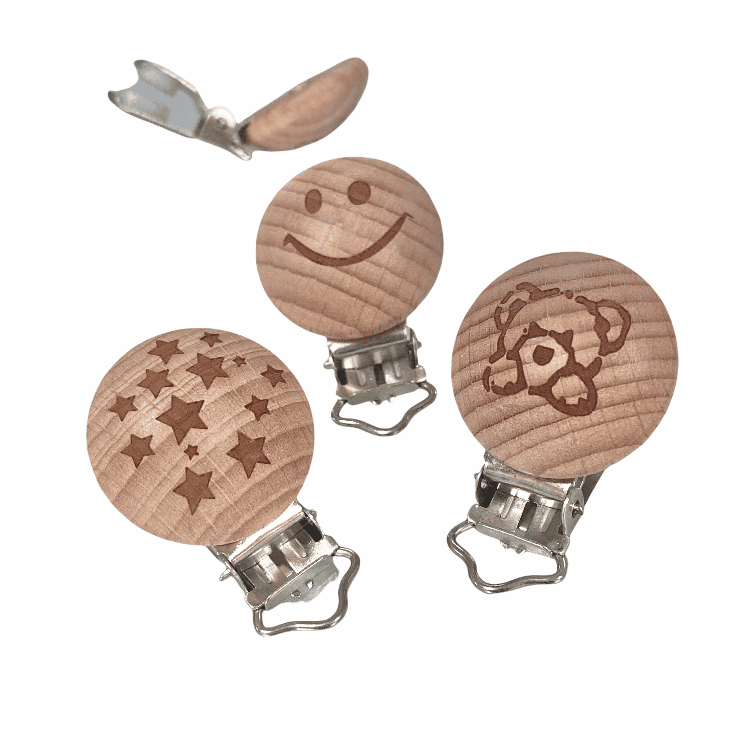 Pinza de chupetero de madera redondo con varios adornos.