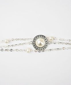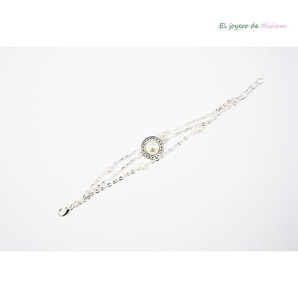 Bonita pulsera de varias cadenas plateadas fabricada con baño de plata y decorada con un medallón con una perla y varias perlas más pequeñas ¡ideal!