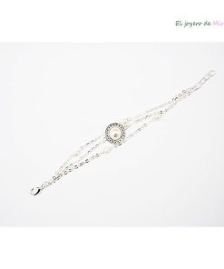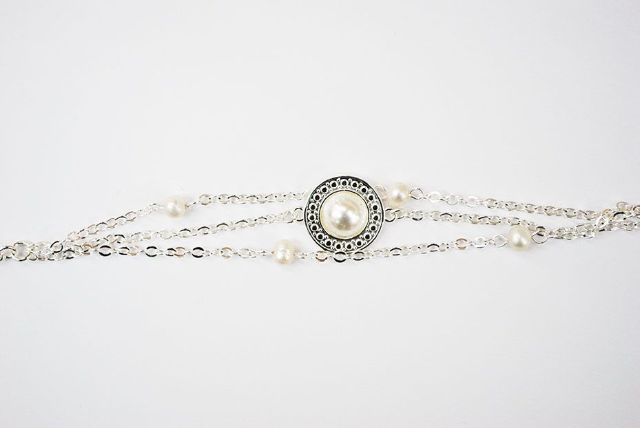 REF: 21/3707- Bonita pulsera de varias cadenas plateadas fabricada con baño de plata y decorada con un medallón con una perla y varias perlas más pequeñas ¡ideal!