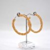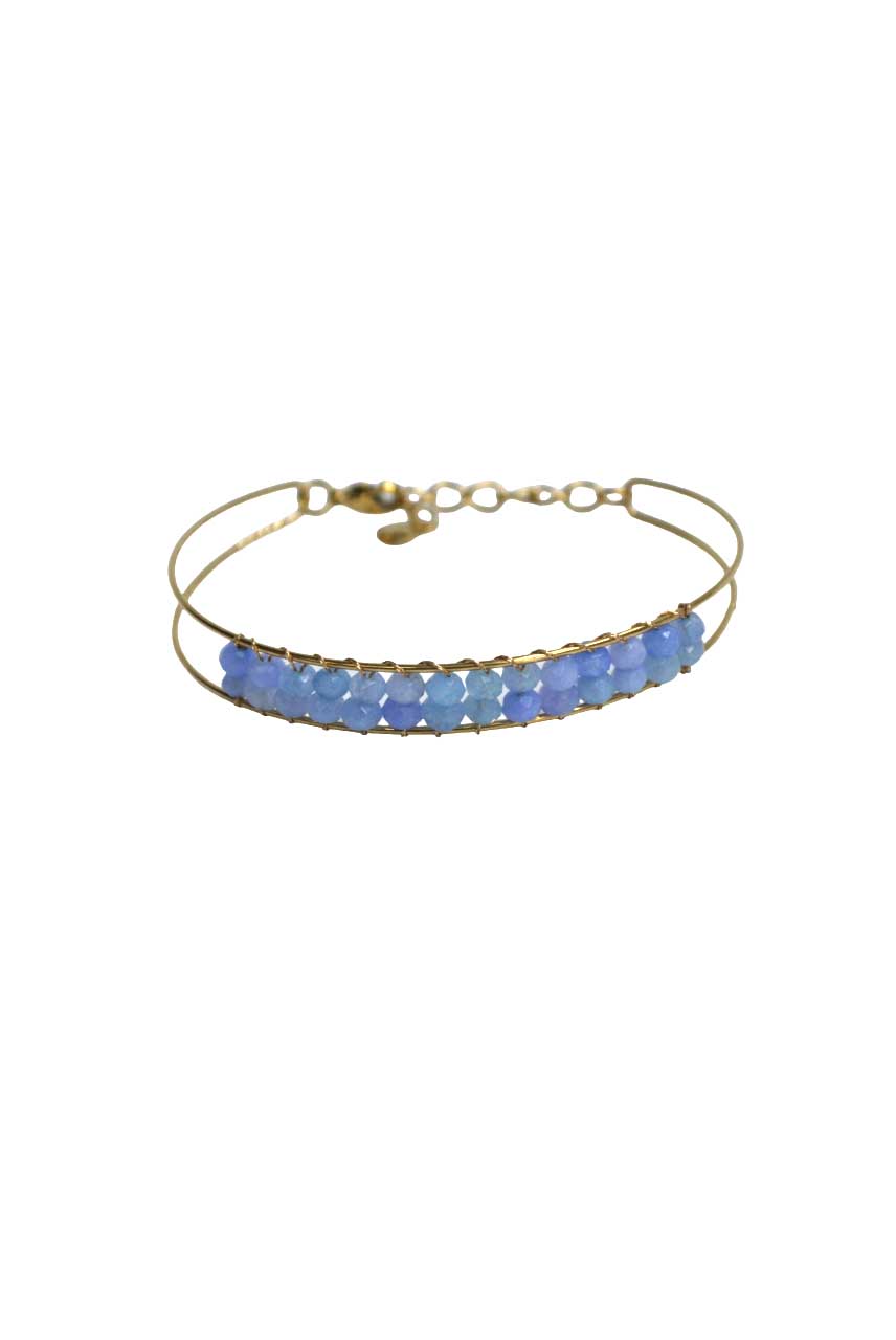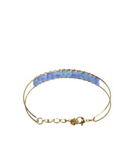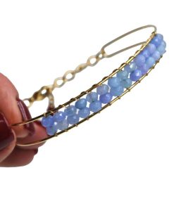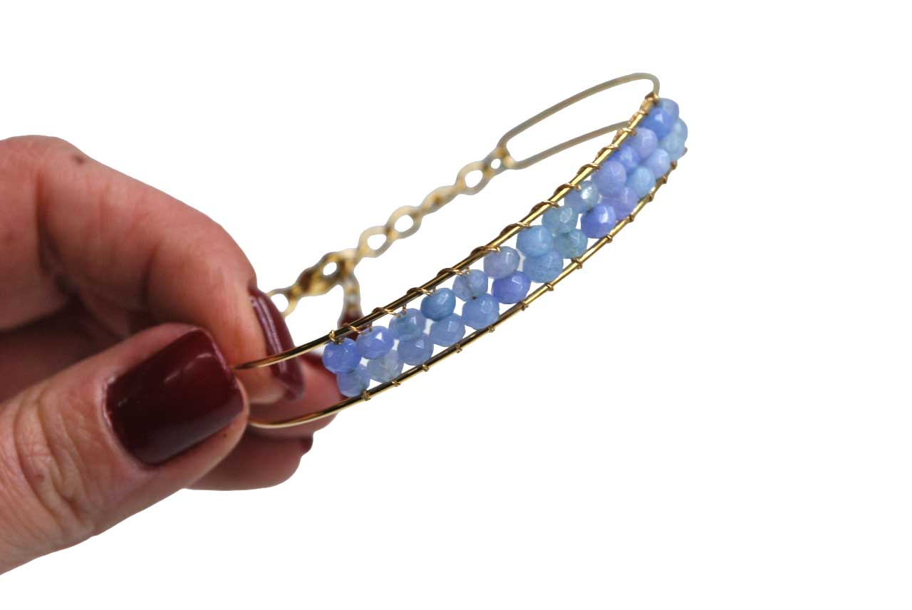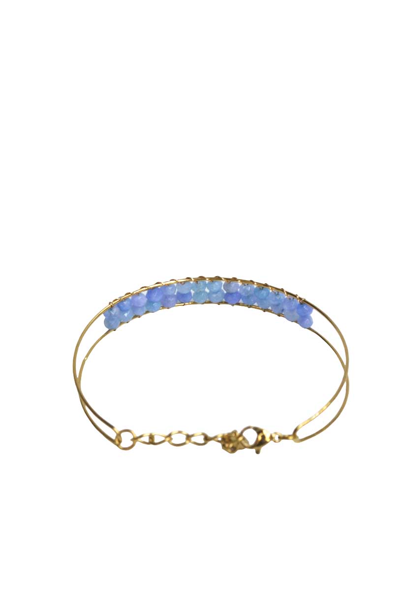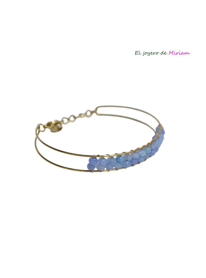 R04/5464 – Bonita pulsera dorada de acero inoxidable. Se trata de una pulsera rígida decorada con pequeñas cuentas de cristal en color azul celeste.