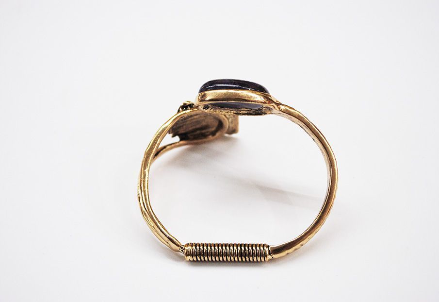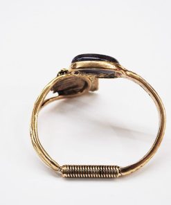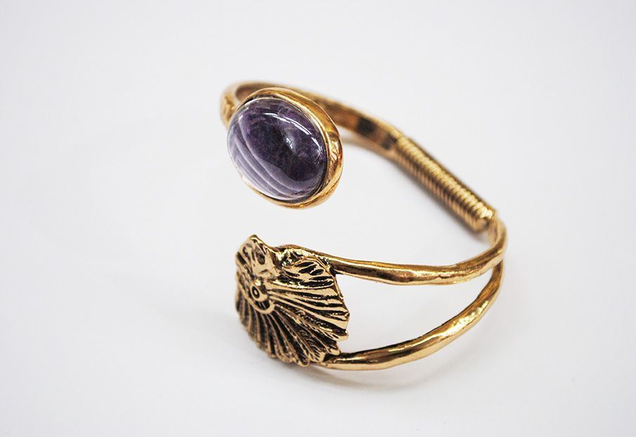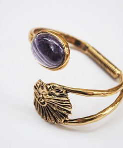 R21/4012 – Bonita y original pulsera o brazalete diseñada en forma de espiral. Se trata de una pulsera realizada en metal ligero dorado envejecido destacando una concha dorada y una piedra circular de resina morada.