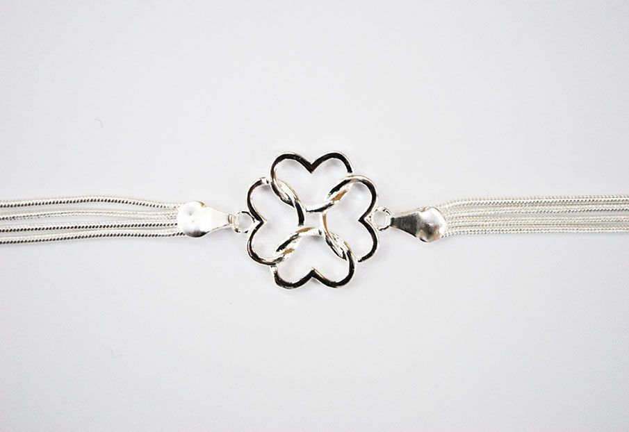 Bonita pulsera de varias cadenas plateadas fabricada con baño de plata y decorada por cuatro corazones entrelazados formando una flor.