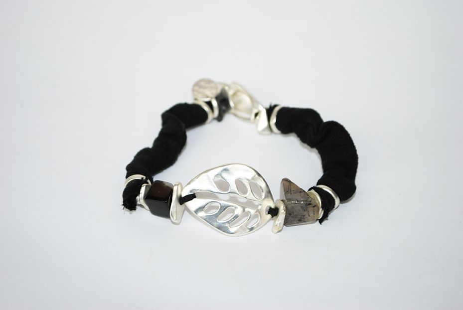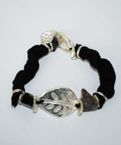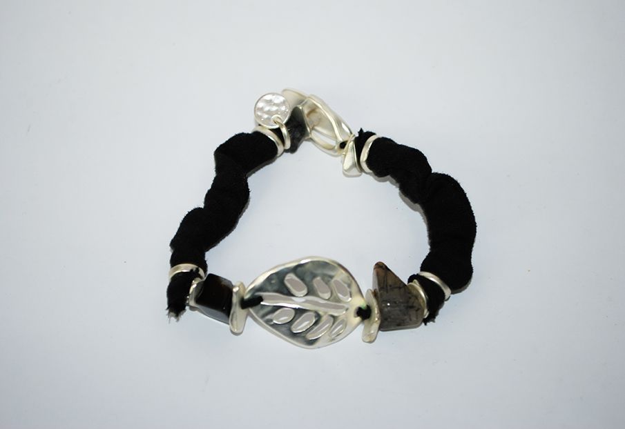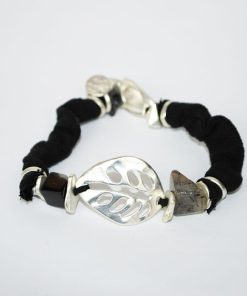 R18/2035 – Elegante y estilosa pulsera de mujer, autoajustable. Se trata de una pulsera fabricada en metal ligero plateado y parcialmente en tela de color negro. Llama mucho la atención la hoja central y las dos piedras naturales al lado de la misma.
