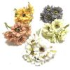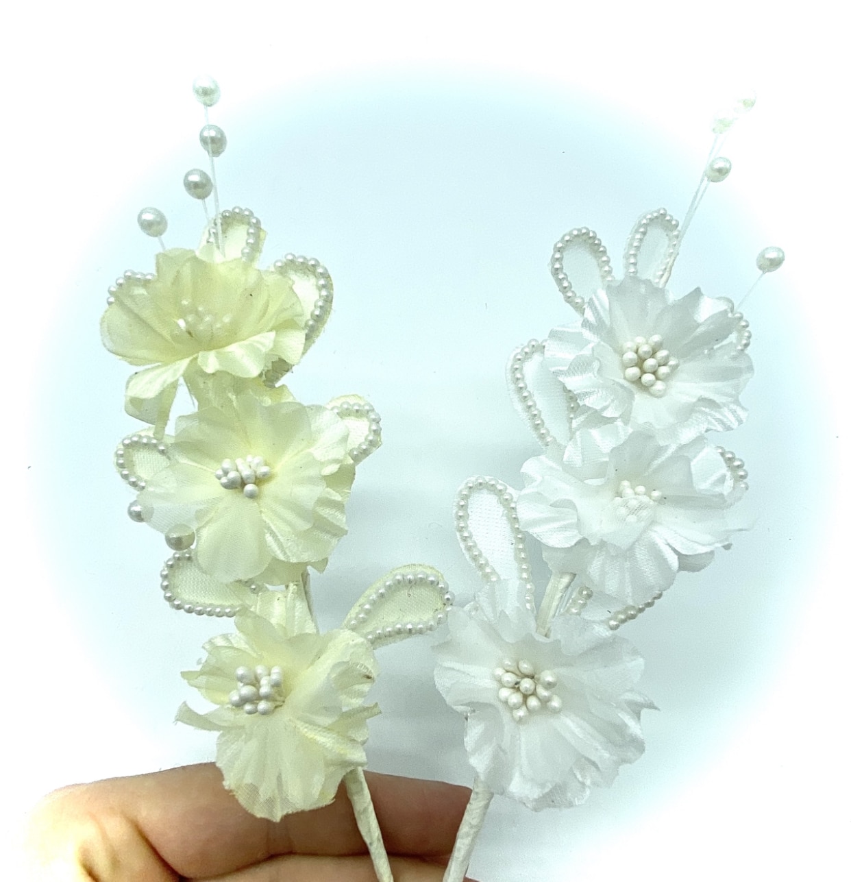 Ramillete formado por tres flores con pistilos, ocho hojas adornadas con perlas y cuatro alambres de perlas; todos ellos alambrados individualmente.