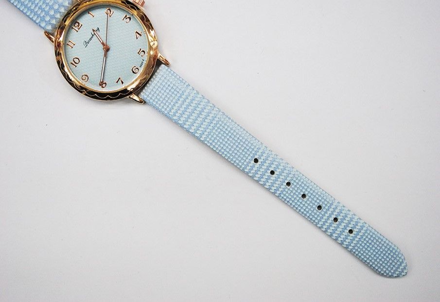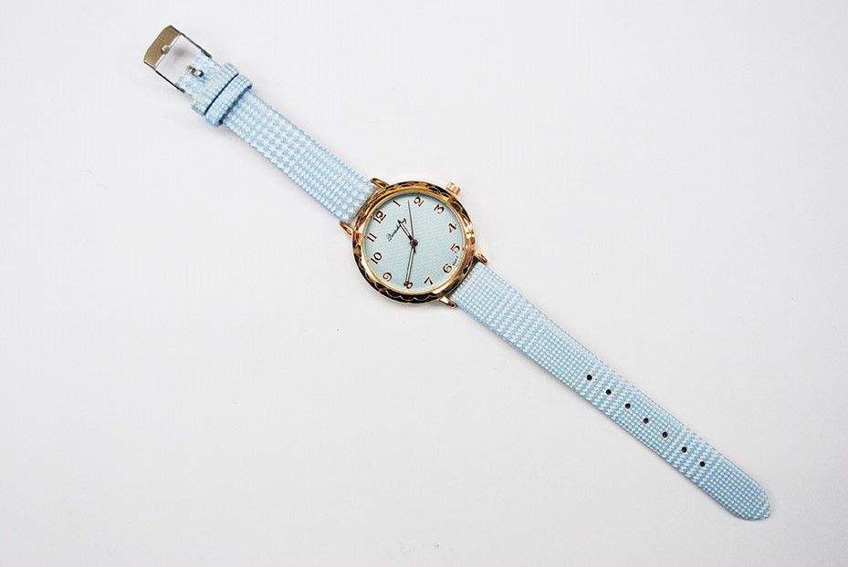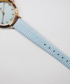 Bellísimo y elegante reloj de mujer con la correa en color azul cielo con pequeños cuadros blancos. Presenta la esfera redonda dorada con fondo también en tono azul.
