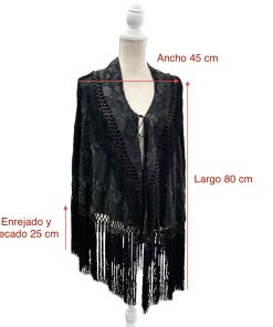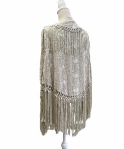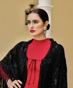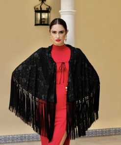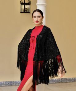 Presentamos nuestra salida de teatro, un accesorio exclusivo y único que no puede faltar en tu armario. Para entenderlo es un complemento tipo capa; está totalmente bordada y presenta un enrejado de borlón con flecos de seda elaborado 100% de forma artesanal.