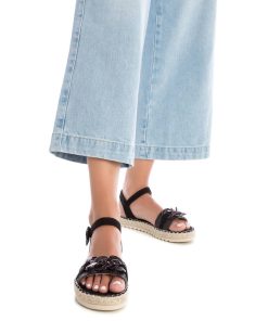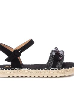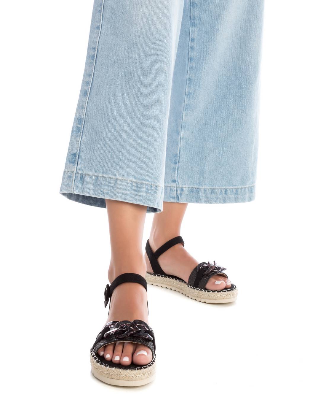 Sandalia de mujer de la marca Xti. Fabricada en material de antelina y material trenzado en la pala. Cadena translúcida decorativa al tono. Cierre mediante hebilla forrada. Suela forrada en yute con suela antideslizante. Este modelo ha obtenido el certificado vegano por la organización mundial PETA (Organización de los derechos de los animales).