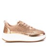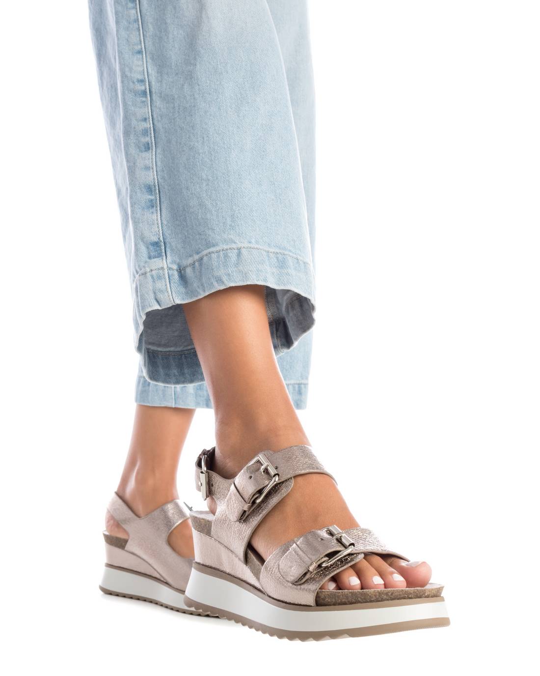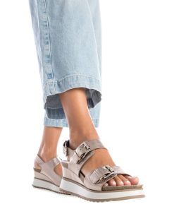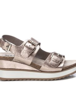 Sandalia de mujer, de la marca Xti. Fabricada en material que imita la piel acabado metalizado. Diseño de doble pala con hebillas metalizadas. Planta bio. Correa al tobillo para mayor sujeción. Suela gruesa de 5 cm de goma antideslizante. Este modelo ha obtenido el certificado vegano por la organización mundial PETA (Organización de los derechos de los animales).
