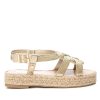 Sandalia de mujer, de la marca Xti. Fabricada en material que imita la piel acabado metalizado. Diseño de doble pala con hebillas metalizadas. Planta bio. Correa al tobillo para mayor sujeción. Suela gruesa de 5 cm de goma antideslizante. Este modelo ha obtenido el certificado vegano por la organización mundial PETA (Organización de los derechos de los animales).